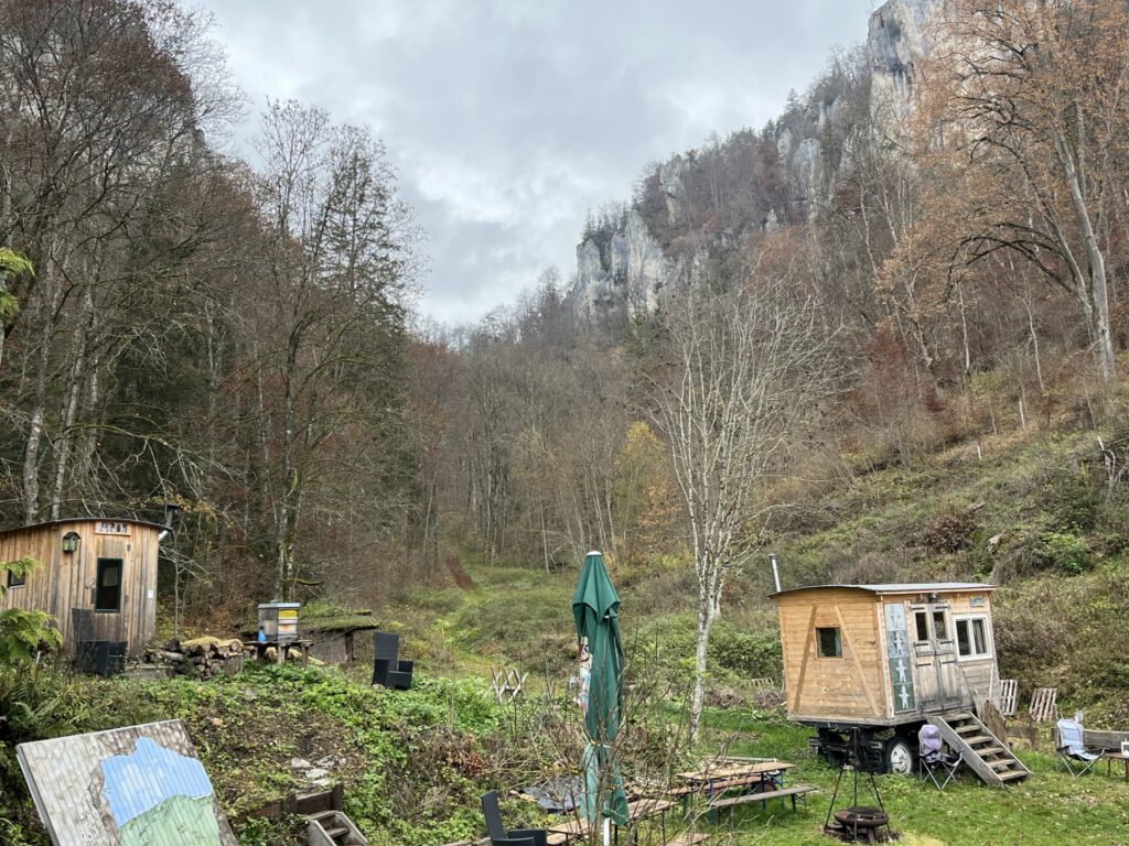 In unmittelbarer Nähe der Fallhütte stehen ein Schäferwagen und ein Bauwagen, in denen eine Übernachtung für jeweils zwei Personen möglich ist.